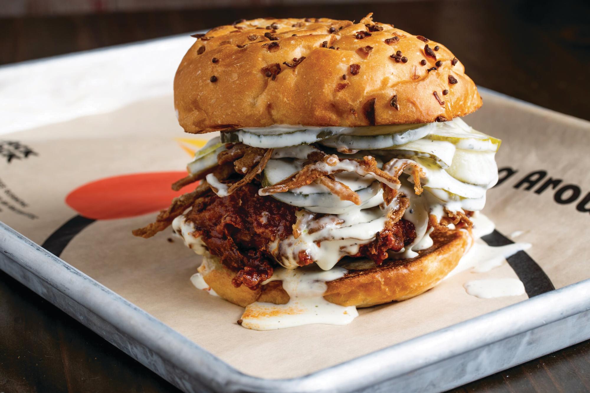 Spicy Fried Thigh, Cool Ranch, Crispy Onions, Pickles, Potato Roll